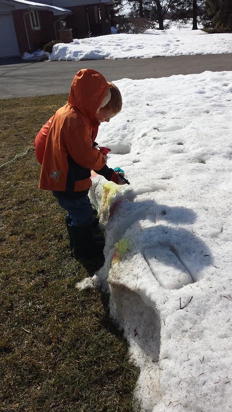 | Well, if spring isn't quite here yet, we'll make our own flowers with squirt bottles and food colouring. They didn't really end up looking like flowers but it was nice to get outside |